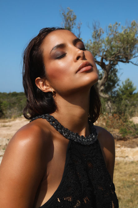 Ogni capo della collezione è pensato per accompagnare questi momenti. Linee essenziali, dettagli luminosi, tessuti che seguono il movimento del corpo e della luce.